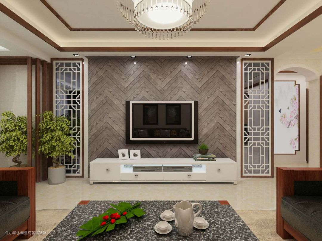 实际装修中,木质电视背景墙和镂空屏风的结合,也让客厅显得十分有质感,整体线条也是以直线为主,突出了方正户型的大气。
