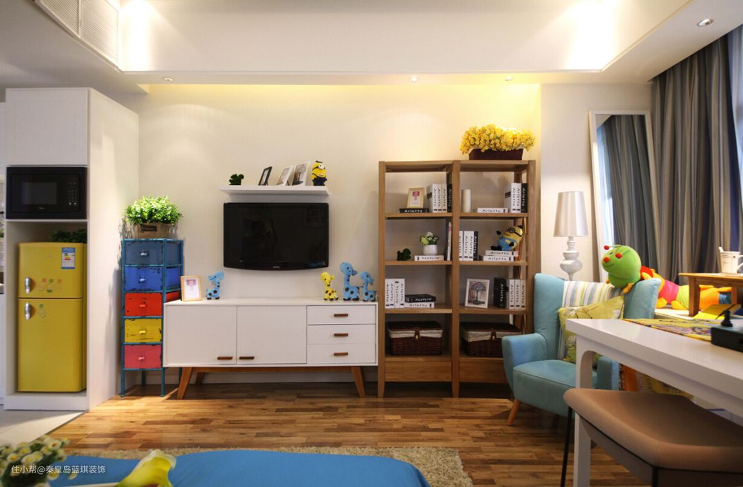卫生间采用了U型设计,以白色为主色调,采用橘色和蓝色点缀。尽管卫生间的面积有限,但是不影响做干湿分离。因原有阳台有个转角的承重墙,利用承重墙和橱柜之间凹进去的空间布置了客厅必备元素:电视&电视柜,当然也是采用简易家具。