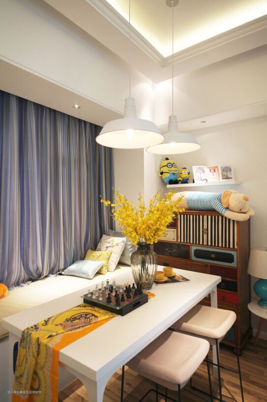 阳台另一端,也就是屋子的西南角被做成了餐厅,宜家风的餐桌搭配飘窗,实现了空间最大化利用,简约小小巧的餐厅就有了。最后是卧室,当然卧室也处于开放式的环境中,床的选择上则可以选择1.5米就刚刚好,这样的公寓住起来还真是舒服!