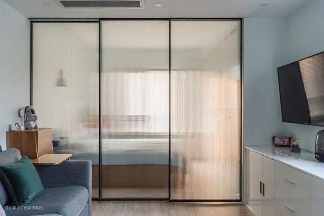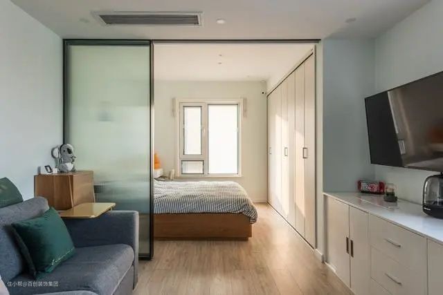 拆除客厅与卧室隔墙,利用三联动的推拉门隔断,改善空间采光通透,又保证私密性。推拉门关上,客厅、卧室彼此独立不影响。推拉门打开,空气流通室内不拥挤。