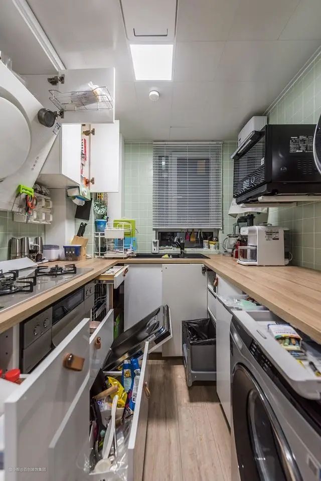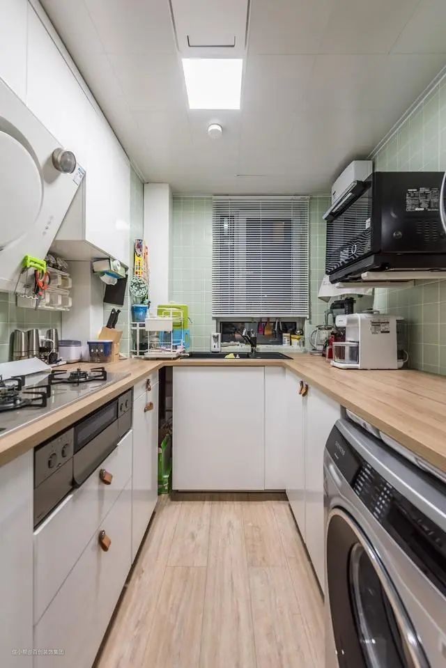 U型厨房设计,满足洗、切、炒、存的合理动线。白色和原木色为基调,完美展现日式的自然舒适。单边吊柜设计,避免视觉上的压抑,利用台面上放空间,摆放厨房大电器,让操作台不拥挤。
