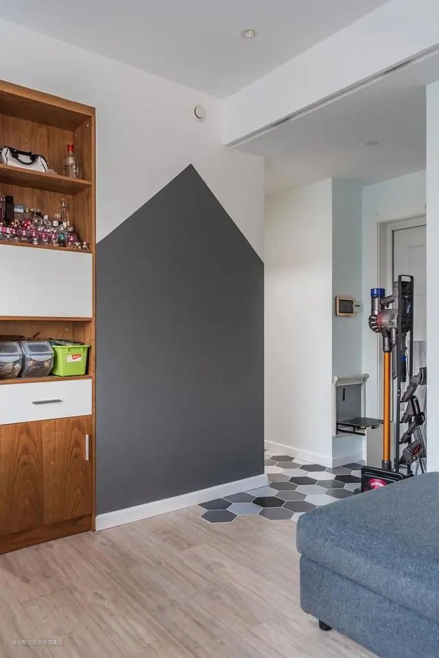入户进门,采用六角砖拼色,深浅色系简约大气极具现代感。六角砖与木地板交相辉映,几何感渗入其中提升空间格调,不显沉闷。为了空间不压抑,放弃通高鞋柜设计,选择了成品的矮柜,满足对鞋的收纳,视觉上也不压抑。