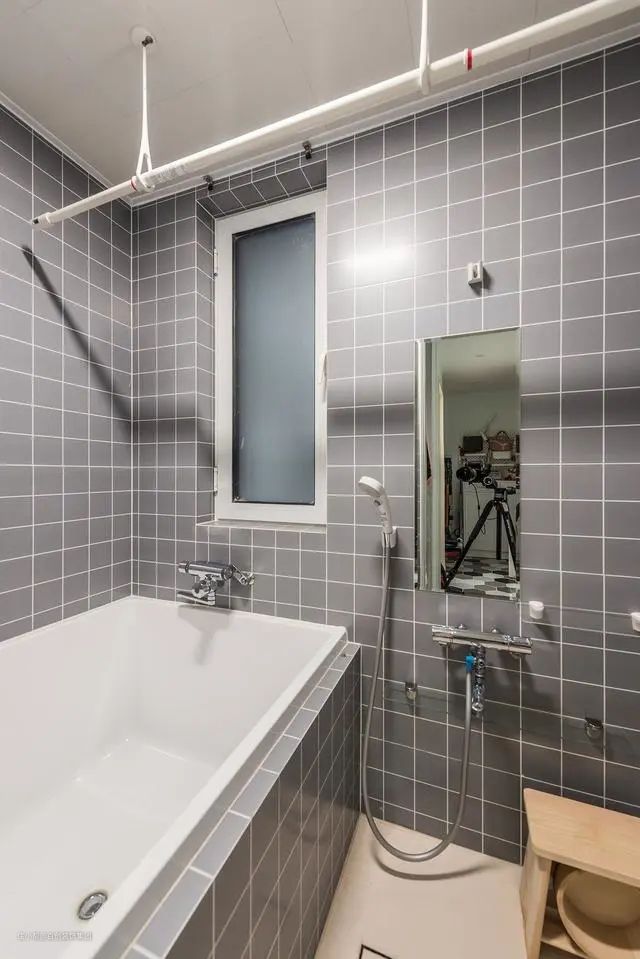 浴室要具备给狗狗洗澡的条件,对于小户型还是非常有挑战的,设计上采用小浴缸和淋浴结合,将问题完美解决。浴室上方还安装了可拆卸晾衣晾衣杆。