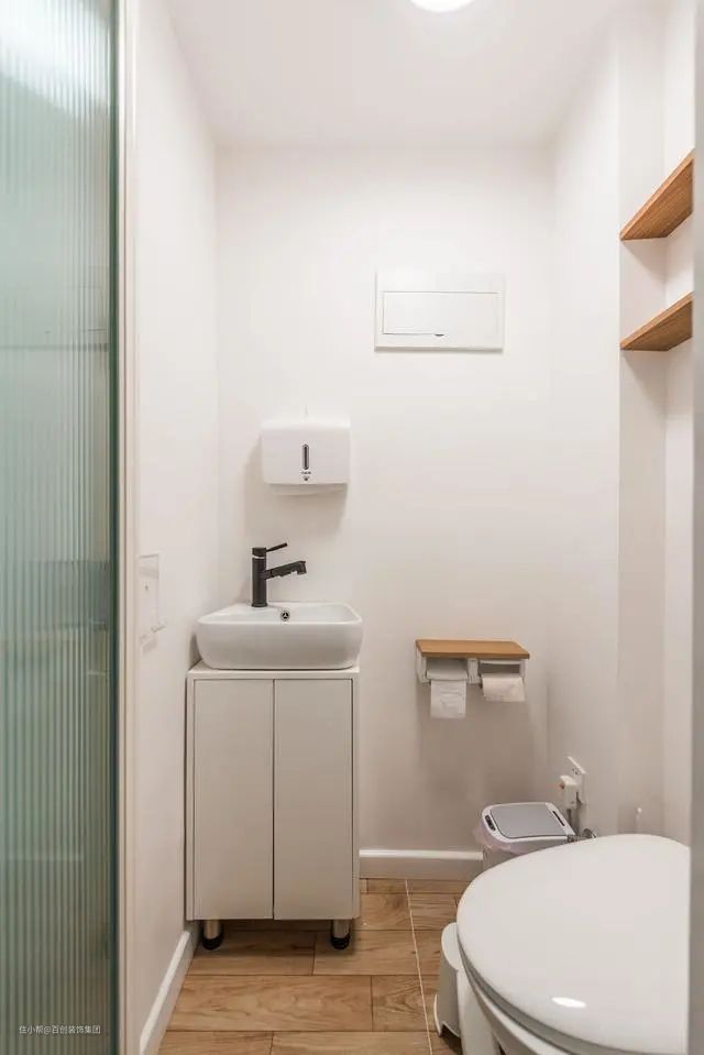 马桶区,白色的洁具搭配仿木地砖,简约自然又耐看。马桶采用无水箱设计,采用自来水直接冲洗,不仅可以防止产生异味,还可以避免水倒流和堵塞情况。马桶前面还摆放了一小台阶,提高使用舒适感。
