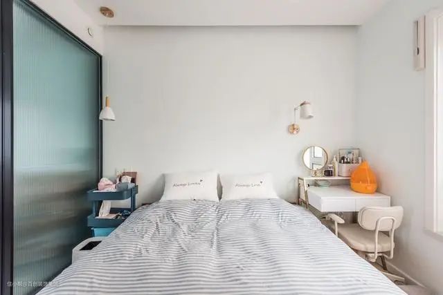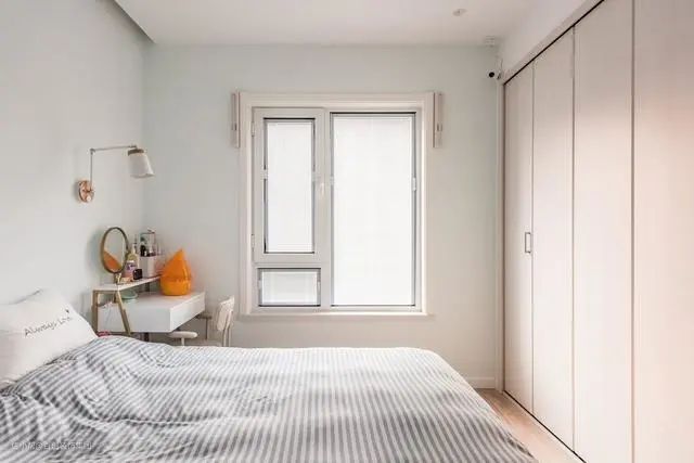 卧室回归睡眠本质,没有多余的装饰和线条,简单的布局营造舒适良好的睡眠环境。床尾一整排的衣柜设计,保证了对衣物的收纳。梳妆台的摆放称得上锦上添花,满足女主梳妆,又充当床头柜功能。考虑到没有阳台,因此窗户两侧设计了折叠晾衣架,展开就可以晾晒衣物,收起来又不影响卧室美观。