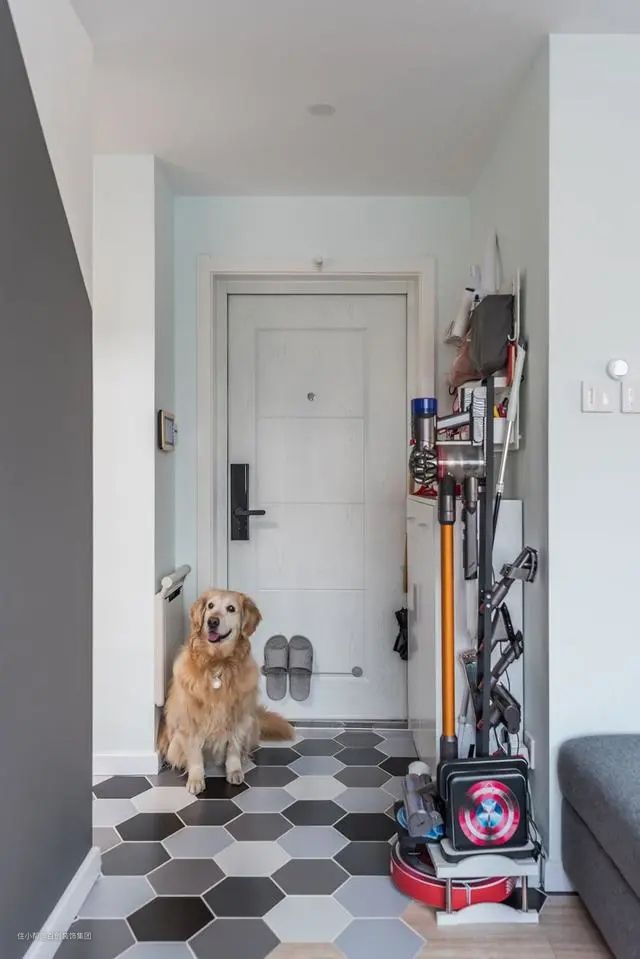 充分利用墙面空间,设计了折叠换鞋凳,占用空间少又实用,进出门坐着换鞋非常的舒适。一面黑板墙给居家生活带来一丝乐趣,可以涂鸦可以当作留言墙,非常不错的设计。与黑板墙仅靠的储物柜,收纳着女主的化妆品和狗粮。