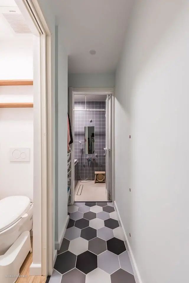 卫生间经过改造,变得更加实用。马桶、换衣间、浴室各种独立,彼此不影响。六角砖一直延伸到浴室门口,几何感的渗透,让空间更有格调。