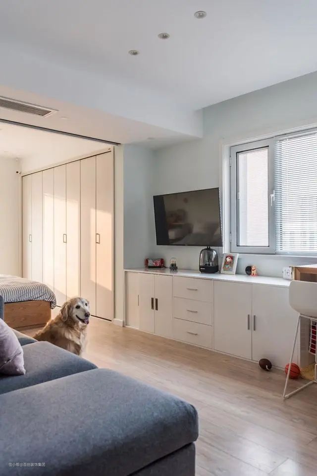 电视柜和储物柜合二为一,利用墙垛做分割线。白色的柜子搭配木色地板,自然舒适,简洁明亮。窗户一律采用百叶帘,避免窗帘过长带来的臃肿和压抑感。柜子顶面巧妙的收纳,将电源线隐藏其中,保持整洁美观。