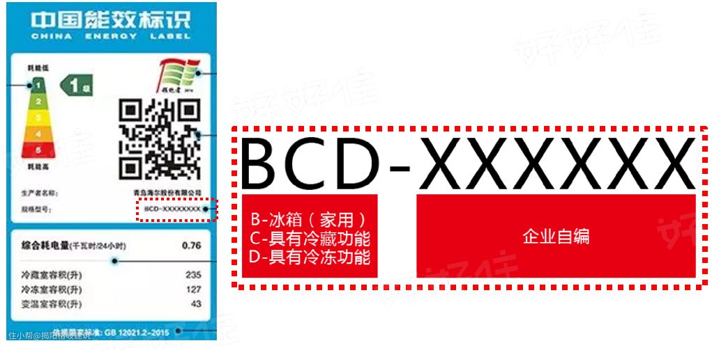 规格型号中:BCD-XXXXXXX,其中B是指冰箱,C是指冷藏功能,D是指冷冻功能。XXXXXXX是企业自编。