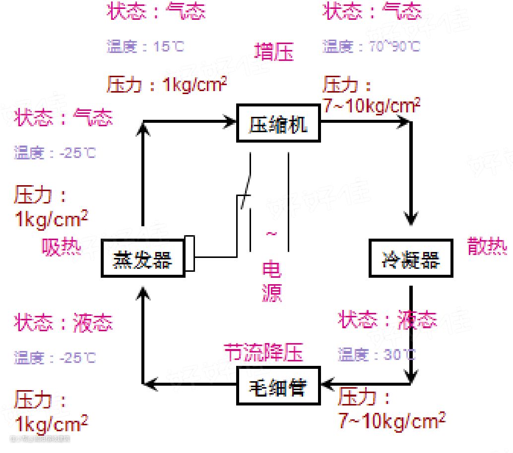 制冷剂:相当于冰箱的血液,实现制冷的重要部件。我们经常听到的无氟冰箱,其实讲的就是制冷剂。