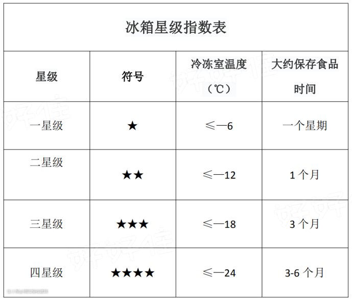 冷冻星级:电冰箱的星级直接反映了电冰箱冷冻室所能达到的温度,是衡量电冰箱制冷性能的重要指标。星级数越高电冰箱的制冷性能就越强,相应的食品在冷冻室中有效保存的时间就越长久。