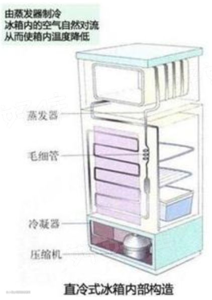 直冷式冰箱是利用冰箱内空气自然对流的方式来冷却食物的,明显的标识是打开冰箱冷冻室抽屉,就能看到“丝管蒸发器”。