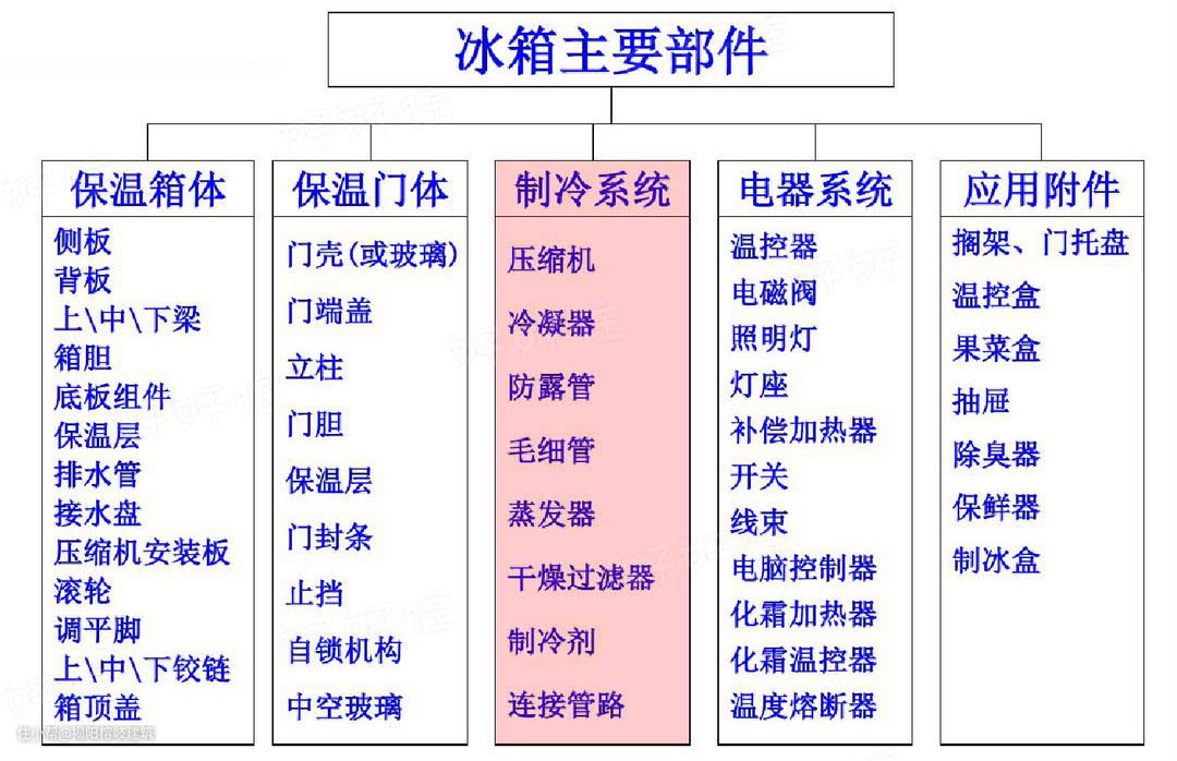 冰箱由保温箱体、保温门板、制冷系统、电器系统、应用附件组成。其中制冷系统是最为重要的一部分,也是本文介绍的重点。