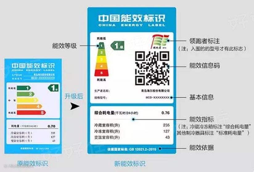电冰箱能效标识的信息内容包括:产品的生产者、规格型号、能源效率等级、24小时耗电量、各间室容积依据的国家标准号。