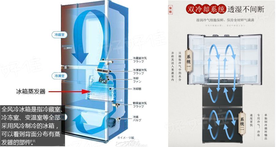 左图是单蒸发器双风道,右图是双蒸发器两个冷却系统。