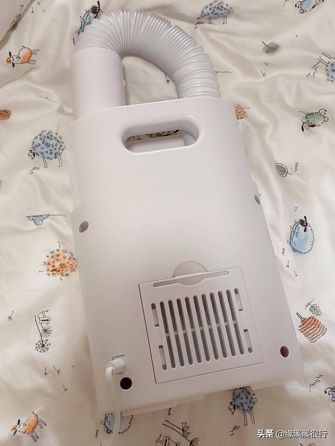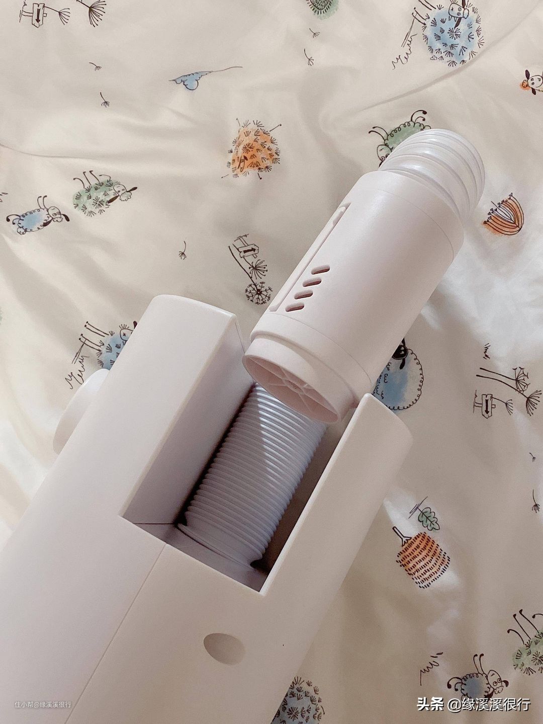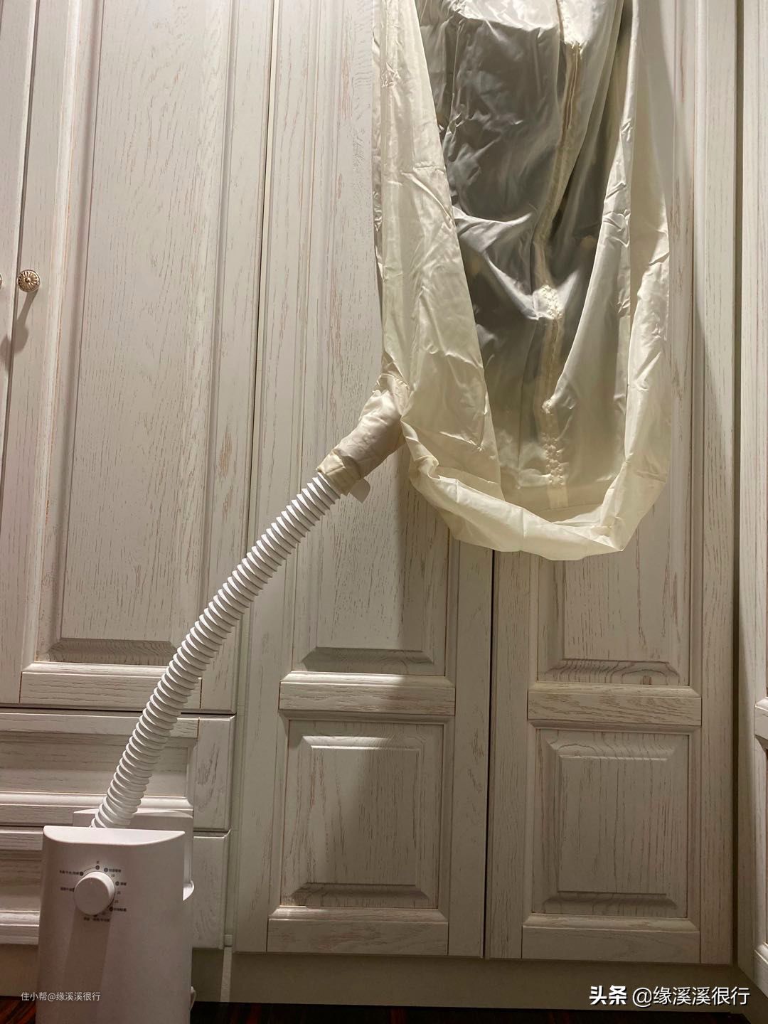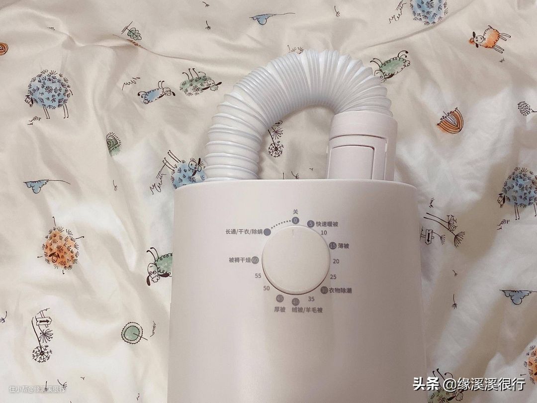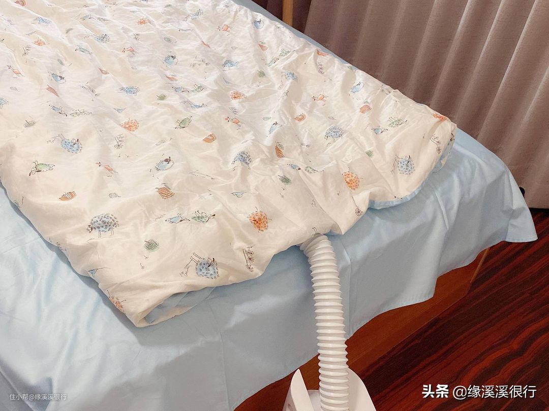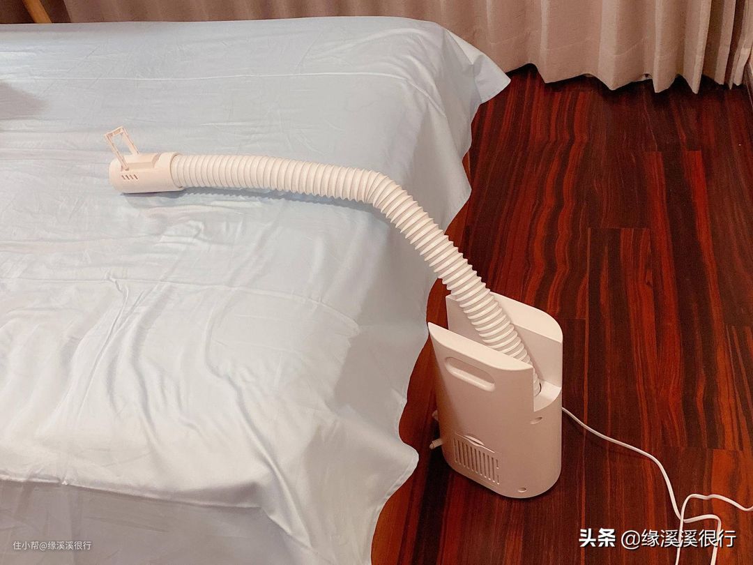 ▲好多北方小伙伴可能还不会用暖被机吧?嘻嘻,在用善思之前,我也不会,不过现在已经用的很老练啦。简单的很,第一步,拉长伸缩软管,放在要暖的床上。善思的伸缩软管可以长达80cm,就算你是公主床架+超高床垫,也可以轻松使用。