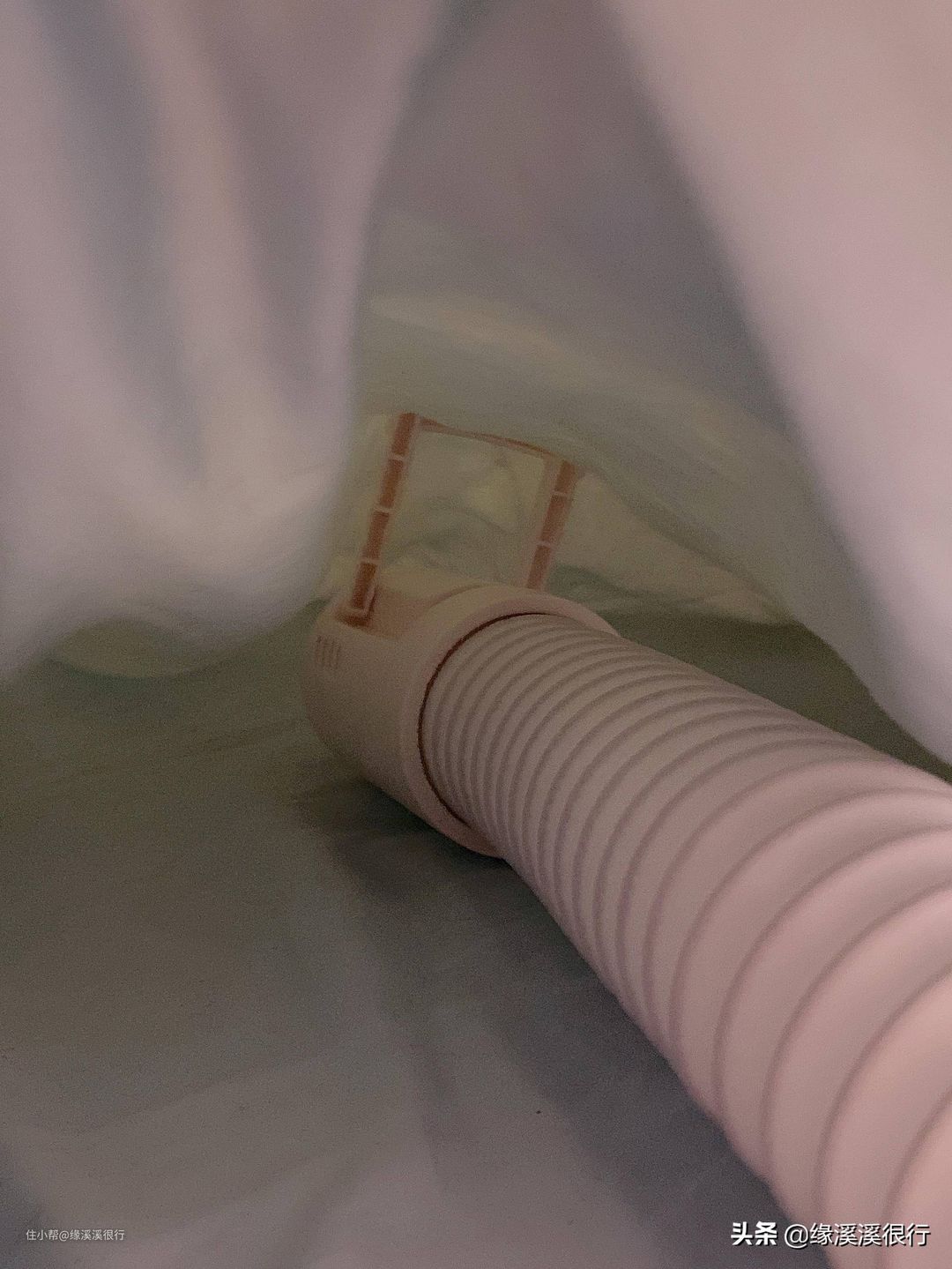▲最后将被子折叠成被窝盖在暖被机软管上,就像是给一个袋子插了一根吸管一样。