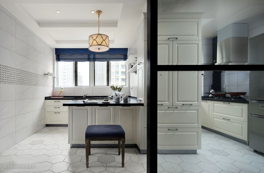厨房地面贴了六角哑光砖加上花砖的点缀,卡拉拉白的瓷砖与米色的橱柜很好的融合在一起。厨房的橱柜完全可以满足各种收纳的需求。罗马帘在颜色上的点缀,使其在米白的空间中更显精致玲珑。