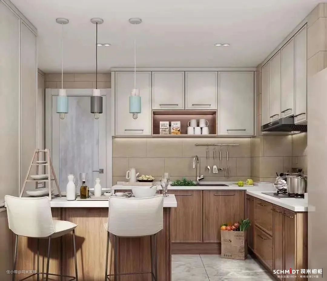 浅色具有上升感、深色具有下坠感。如果你的厨房较小,可以在顶部使用浅色,让顶部产生上升感,拉长顶部与底部的距离。