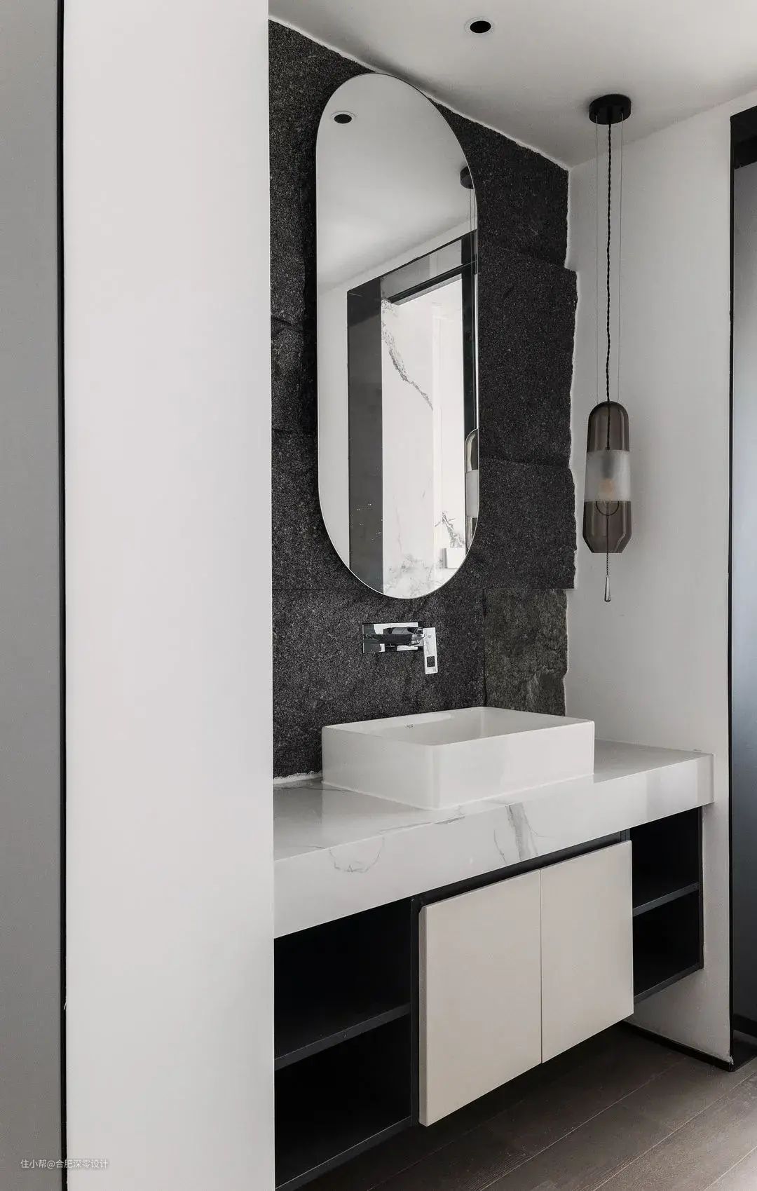☞洗手台外移,将干区独立开来,平时早晚洗漱也不用进卫生间,有人在洗澡、如厕时,也不影响洗手台的使用。而且,洗手台拎出来之后,颜值也妥妥在线!