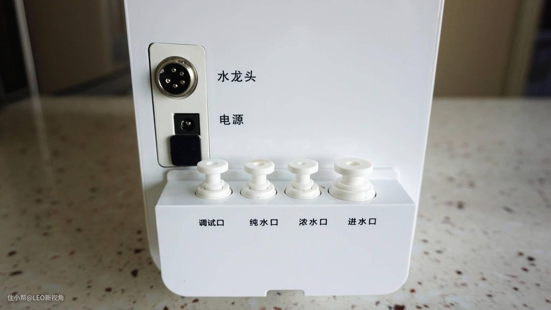 机身背面下方分别是水龙头感应灯插座,电源孔和调试口、纯水口、浓水口和进水口,后面四个是连接PE水管的,其中进水口采用的是3分管,进水量大,出水的都是用2分管。