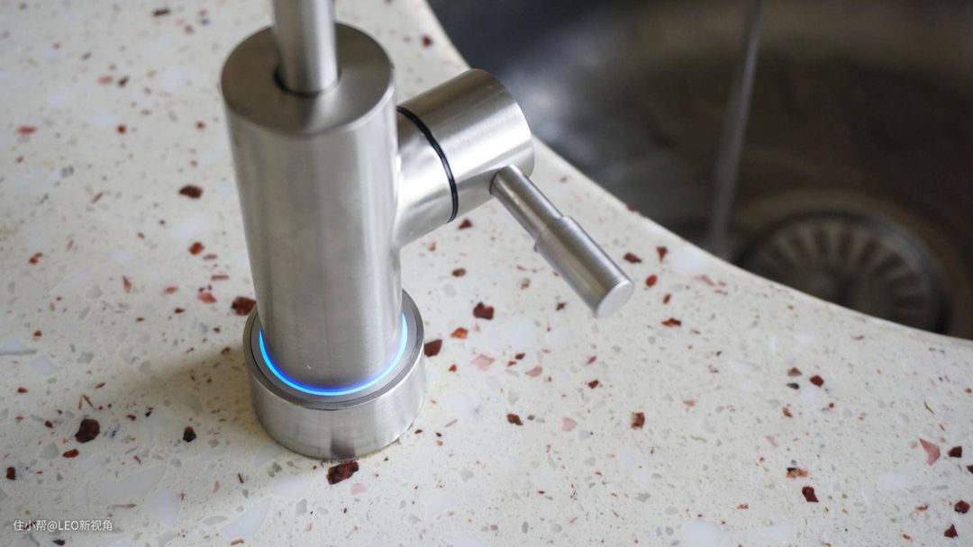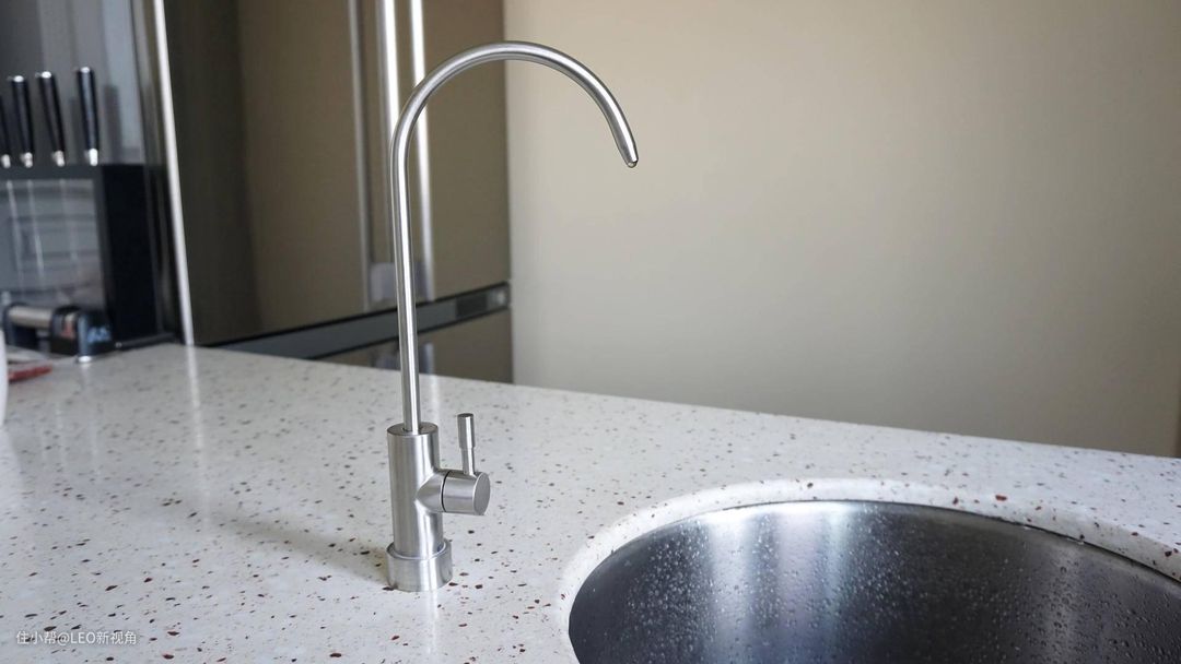 所以没有再打孔,直接将净水机龙头替换了原来的水龙头,整体上风格并没有违和感,而且这款净水龙头更细巧,反而让这个操作台显得更宽敞了。在水龙头底部需要接一个2分管的接头,后面的线对应连接到净水机上。