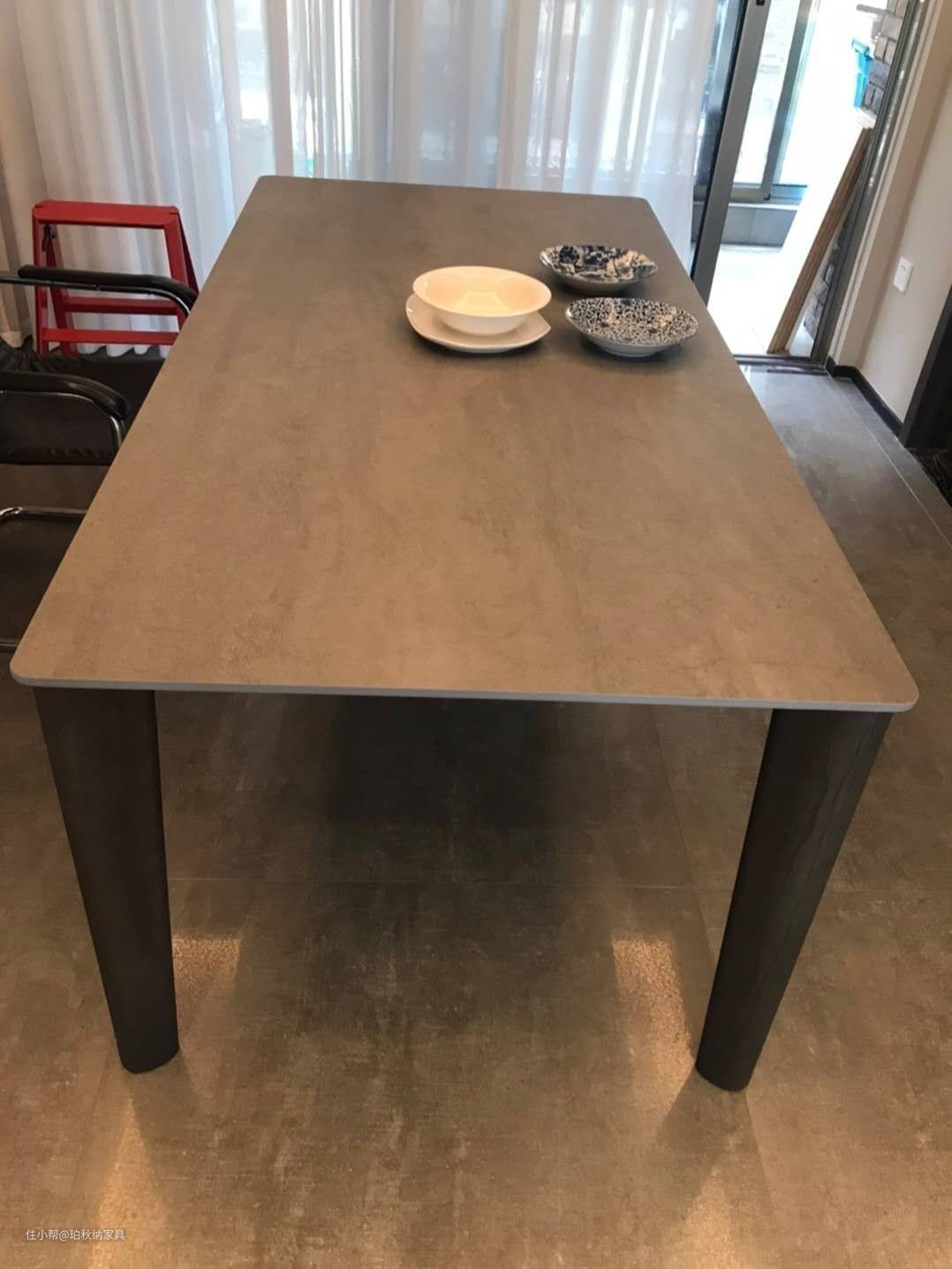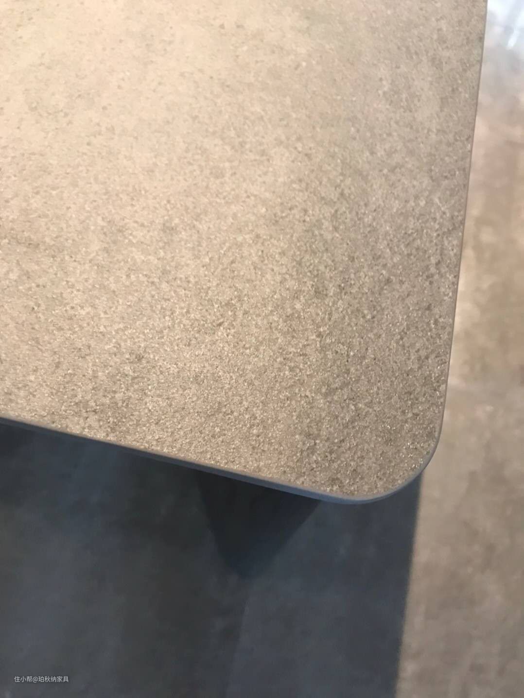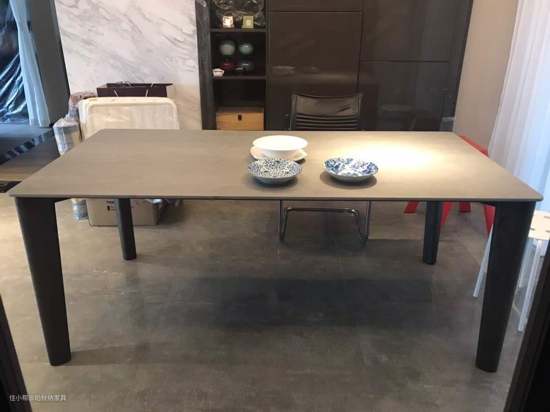 意大利进口岩板一个好的餐桌,桌面的材质是十分重要的,而这款餐桌桌面采用意大利进口拉米娜品牌岩板,关于岩板产品,我在做装修的时候就有了一定的了解,所以在选家具的时候,不再考虑其它品牌,一分钱一分货总是没错的,底部有纤维网,防止发生断裂危险,不像国内的岩板,粗糙的底部再用胶水粘一块密度板餐桌表面摸起来是光滑的,看着有一点点磨砂质感,特意用钥匙刮了,没任何痕迹,吃饭有汤汁滴在上面,抹布一擦就了,不愧是高端岩板产品,耐高温、耐磨刮、防渗透等优秀品质。(图4为灰沙小样照片)