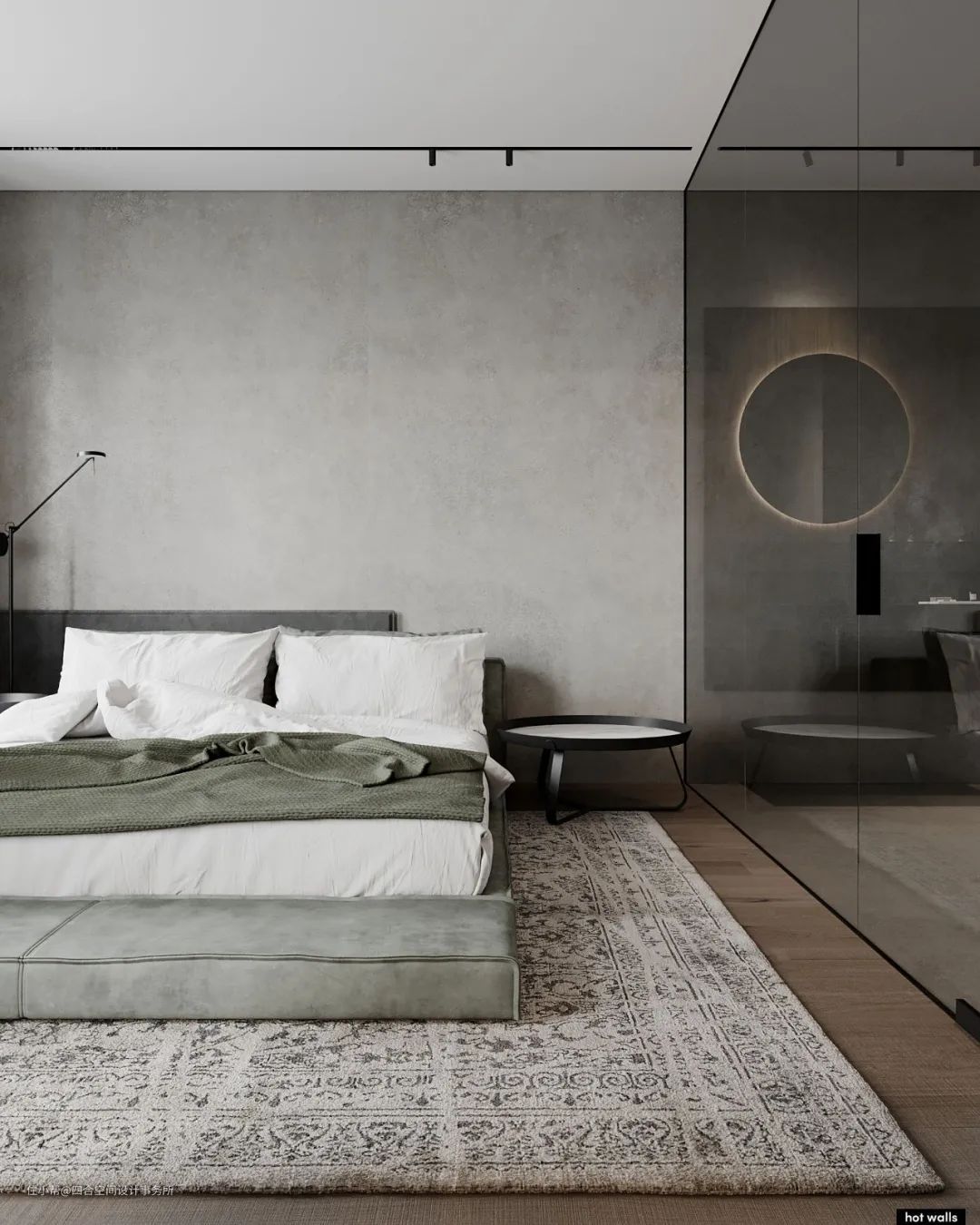 卧室的空间,用了浅绿色,灰,木色色系,静谧,舒服。衣帽间在深色玻璃后方,浴室位于另一侧。