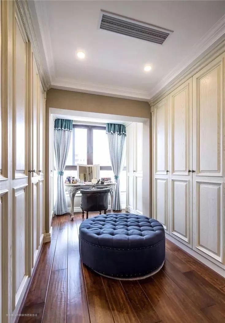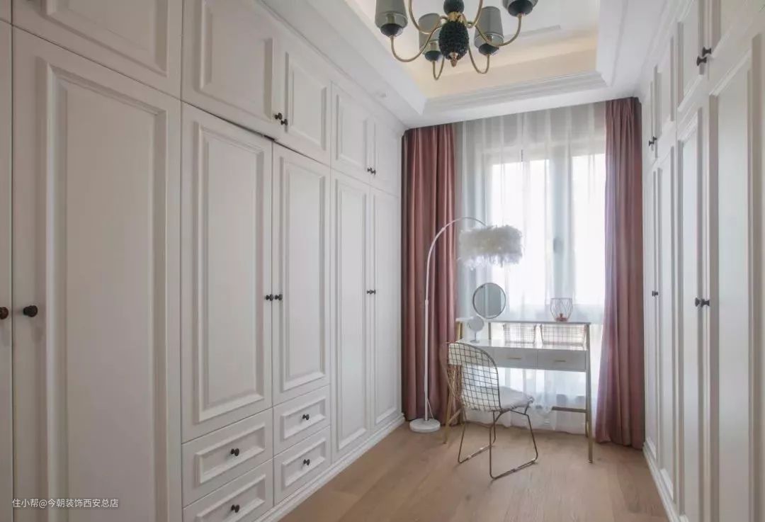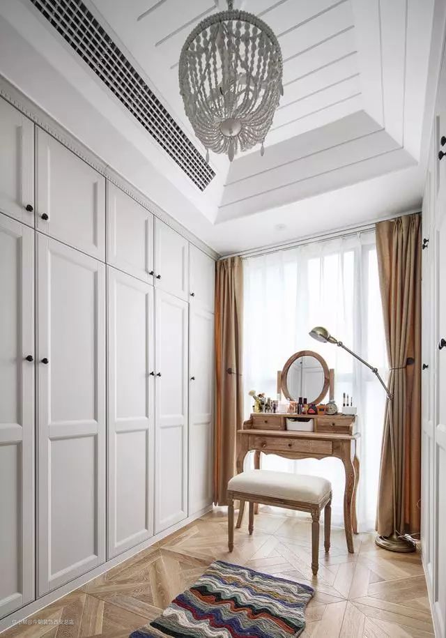 独立的衣帽间内,通常会选择布置一个梳妆台,四周环绕着开放式的衣柜封闭式的抽屉柜,衣服根据长短、类型来分类存放。
