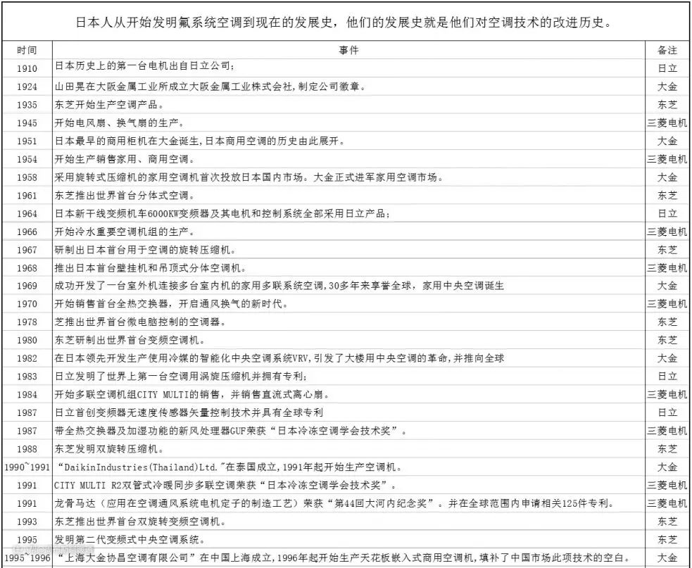 美国人1902年就发明了水系统空调,日本人跟进其后1935年开始生产氟系统空调,然后就是一条道走到黑,认定了氟系统就一只开发氟系统,不做水系统,在自己的领域做到最好,同时日本国内有很多关于节能方面的大奖,不断刺激日本人对于节能方面的深入。所以一直到现在,我们作为经销商也见证了四大品牌技术的不断更新换代,作为业主也享受到了更加高端稳定的技术产品。