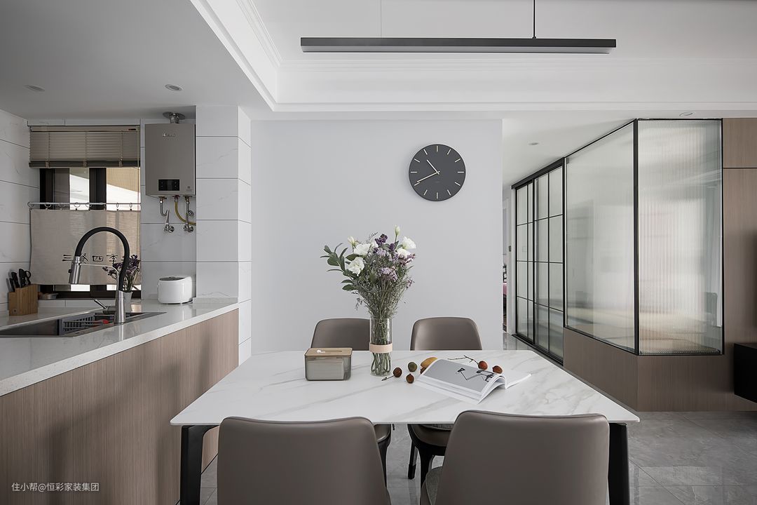 餐厅位置位于客厅背后,紧挨沙发。同时,也是考进厨房的位置。厨房的空间改造,让餐厅与厨房之间没有完全地隔断,整个空间感会更好。