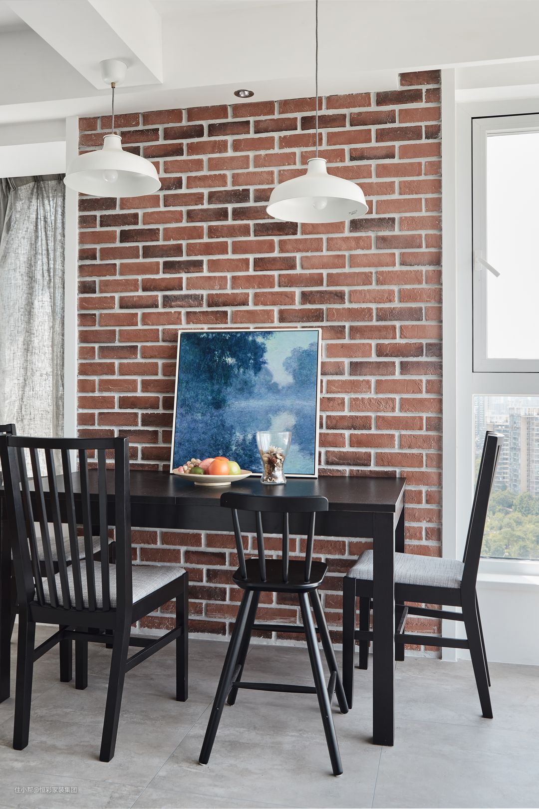 餐厅空间融入了黑色金属框的隔断,同时餐厅背景墙用砖墙作为装饰,极大地保留了工业风的味道。再配以黑色硬朗的餐桌椅,营造沉稳厚重的气息。
