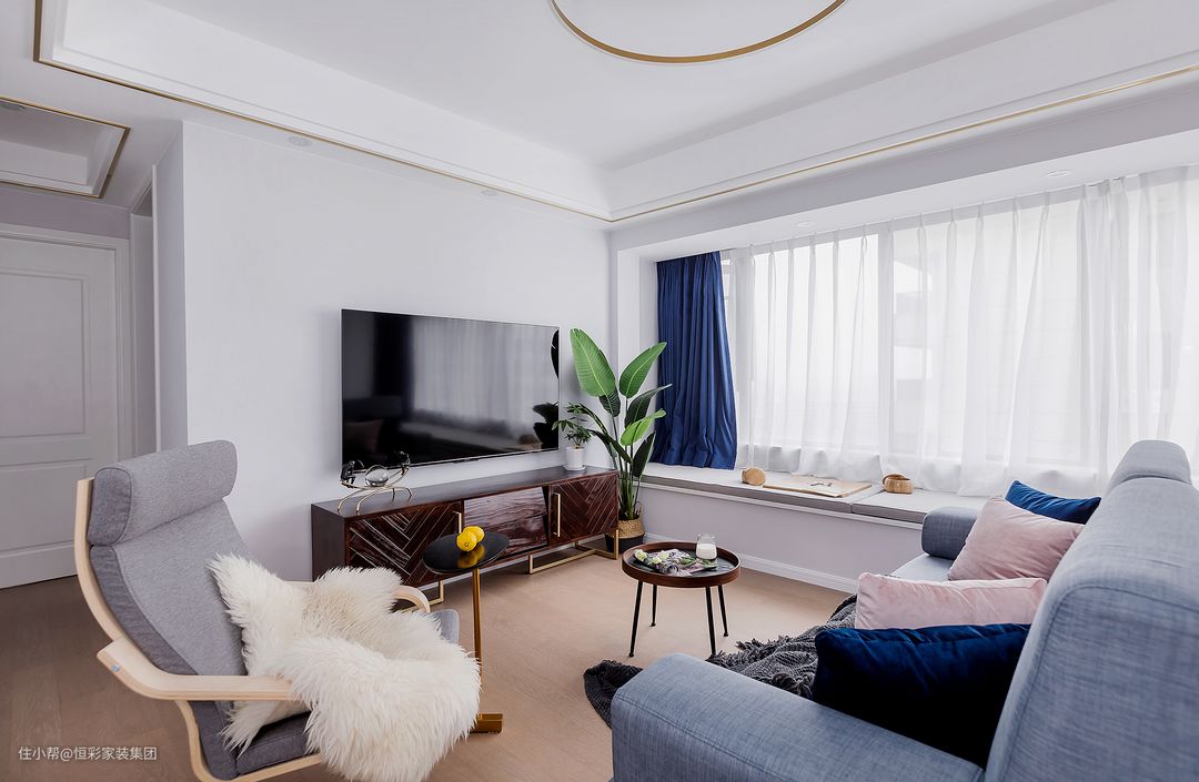 客厅空间以白色作为背景色,非常干净简洁。简单的吊顶配合金色金属条走边,纯净的色彩里面带着一点小轻奢的味道,配合家具的金属走边,非常契合。