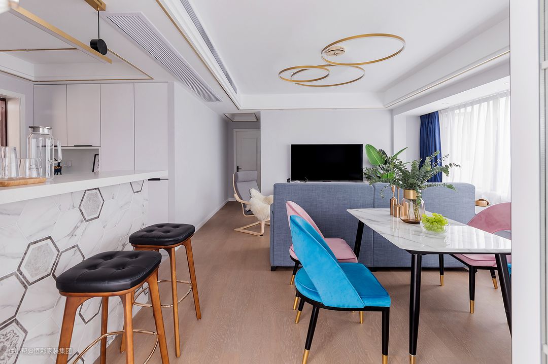 两室改三室,主卧的阳台敲掉包进来,隔成两间房;进门就是厨房,厨房做半开放式,利用吧台隔断餐厅区;整个风格设计上,追求极致的简约而不简单,在材质和色彩上强化空间装饰感。