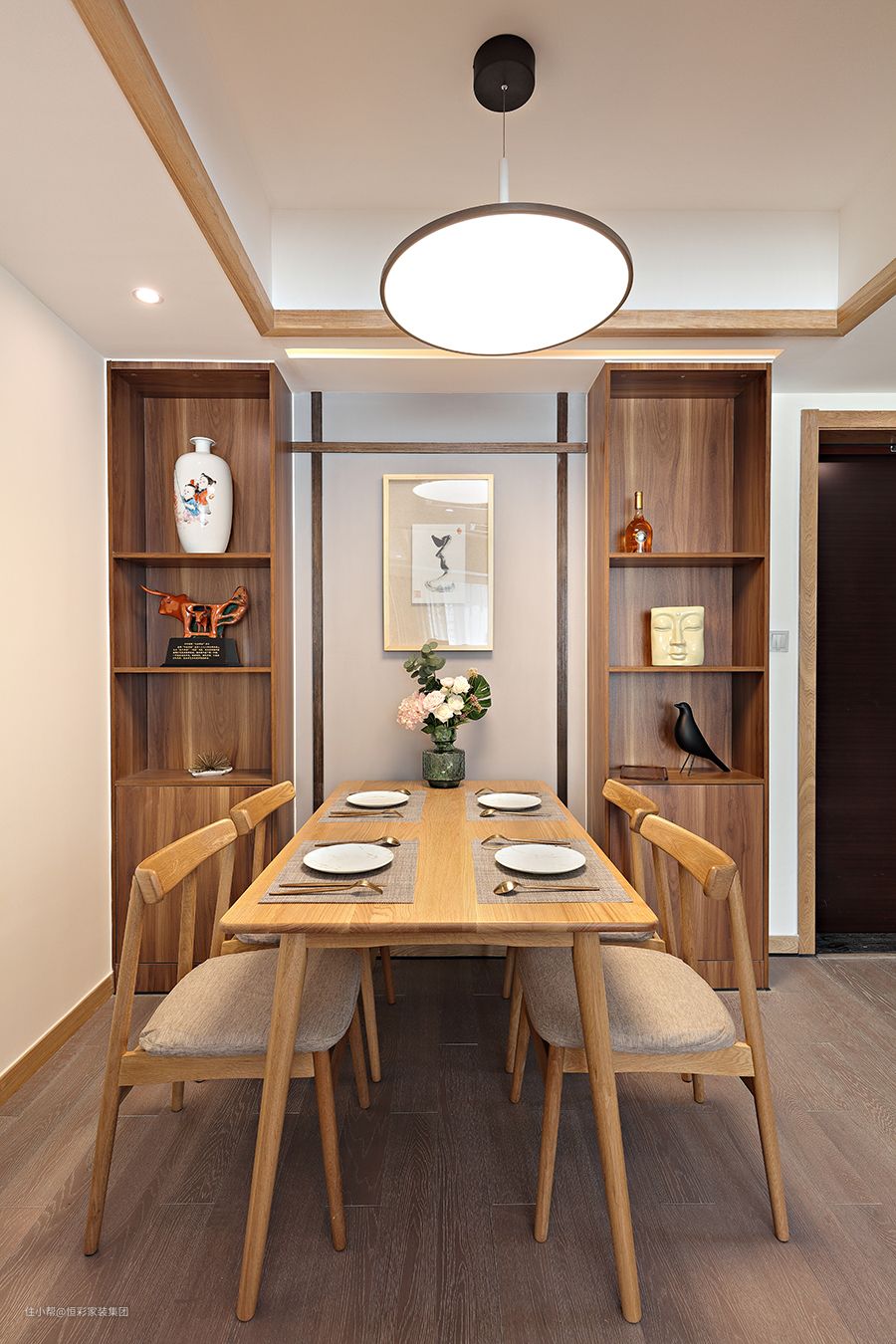 餐厅集中采用仿古木色做为主色调,原木色的餐桌椅边上色彩稍重的仿古木色橱柜增添了几分禅意元素。