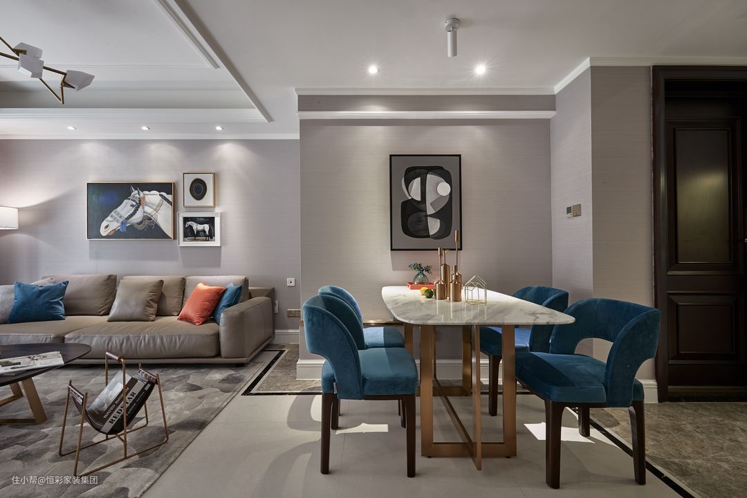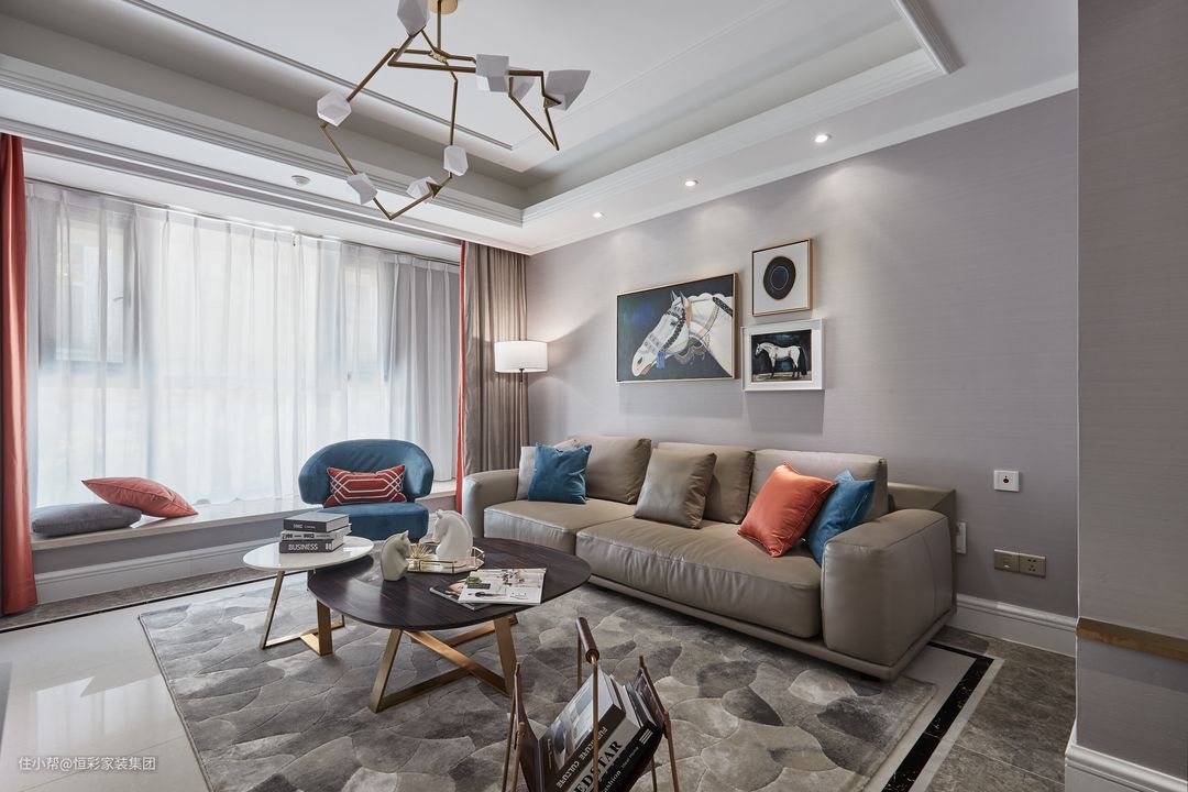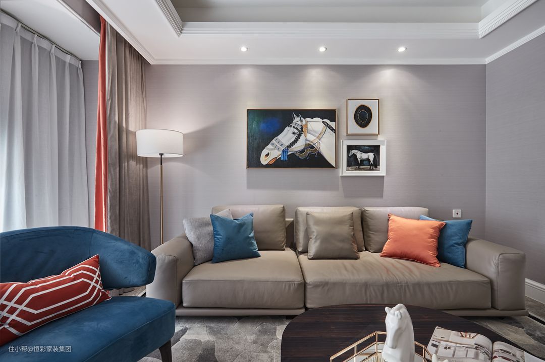 客厅以浅灰色作为主色调,跳跃的橙色与蓝色软配作为点缀,呈现出空间的动与静态美。