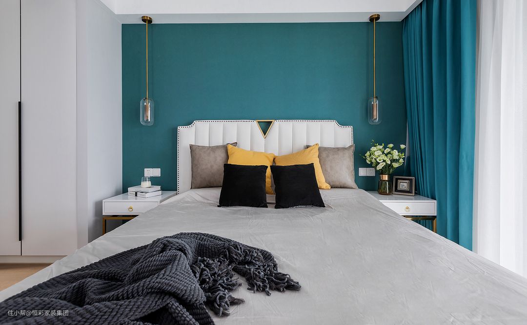 主卧灰蓝色乳胶漆背景墙,搭配简单的床头吊灯,家具选择上也是追求舒适性,简单清爽。