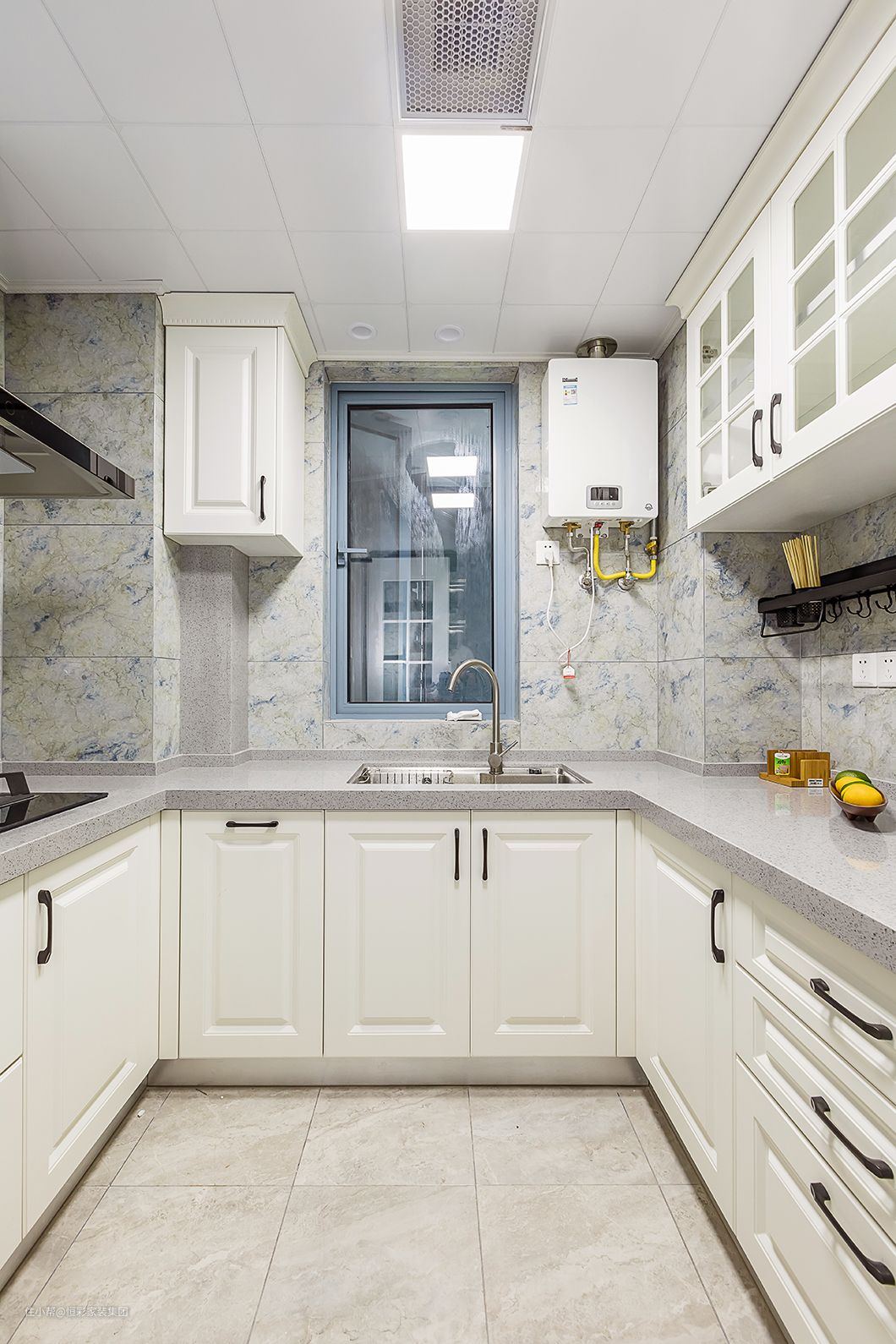 厨房空间不大,小u型半开放式设计增加空间感,白色漆面方砖清新干净,大量白色的使用,让人耳目一新。