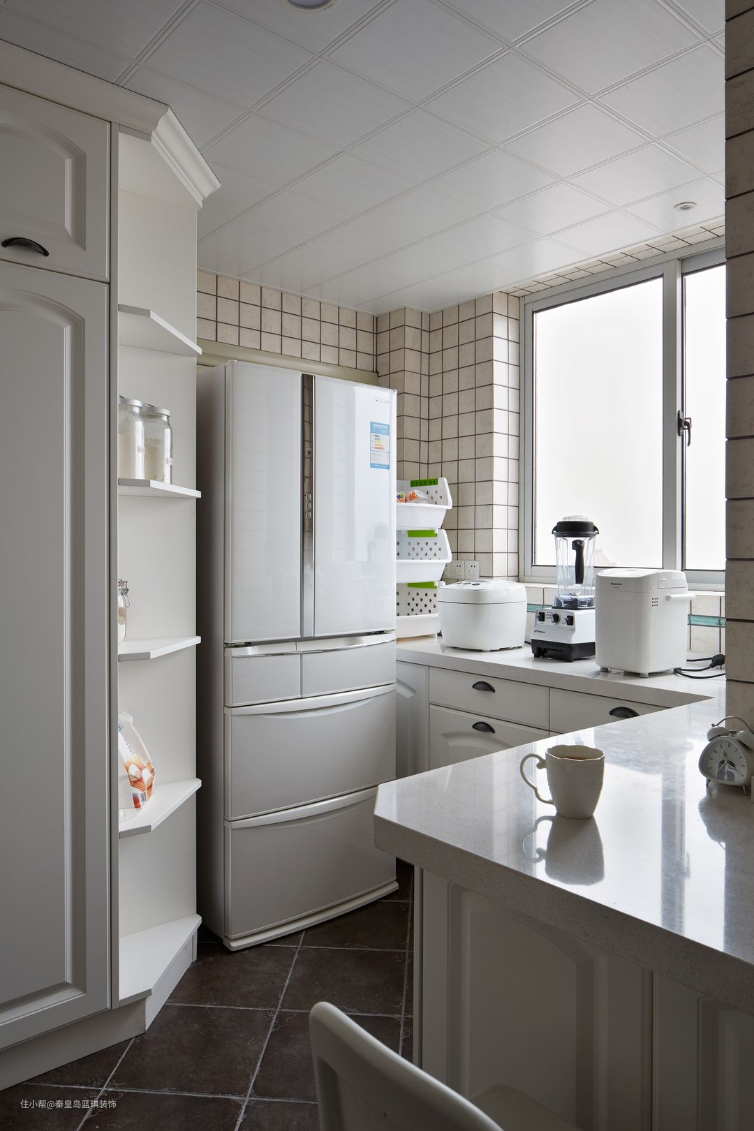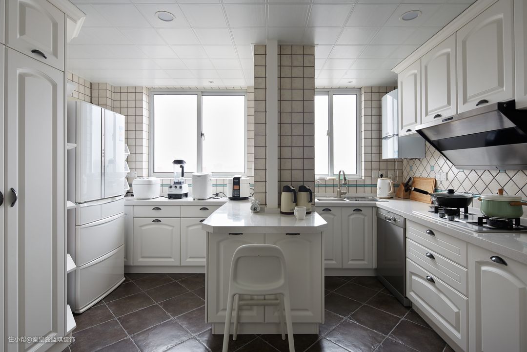▲说到胃口,一个空间合理、使用方便的厨房必不可少。厨房本身空间较大,做成了开放式,油烟区和无烟区分开,比较好清理。为了充分利用空间,在隔离墙的周边做了桌台,这样早饭或者简餐就能一步搞定了。