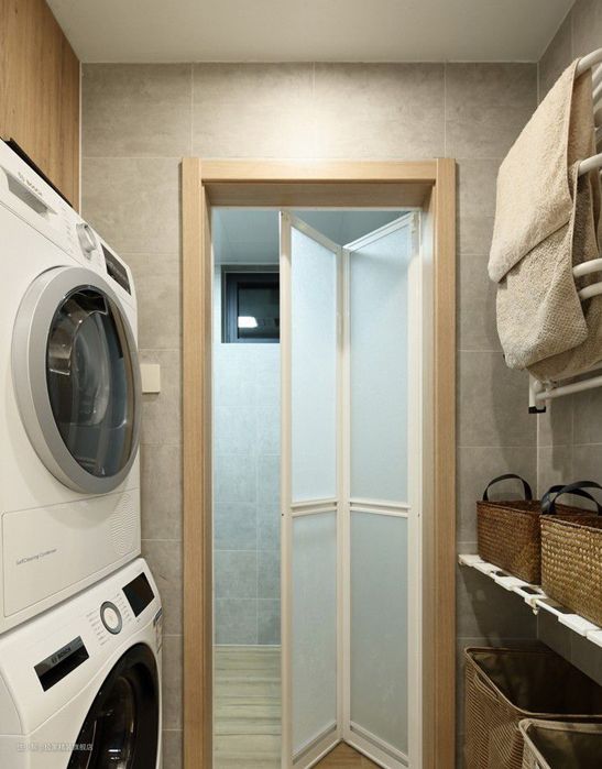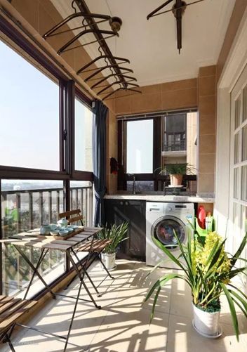 如果你不希望因晾晒而破坏了家里的环境,就像本期案例的业主一样,不喜欢阳台被衣物挂的乱糟糟的。那么利用厨房或者设备阳台隔出一个洗衣房,顶部安装带有烘干效果的晾衣机,还能将洗衣机、烘干机统统放进去,即洗即晾,省时又省力。