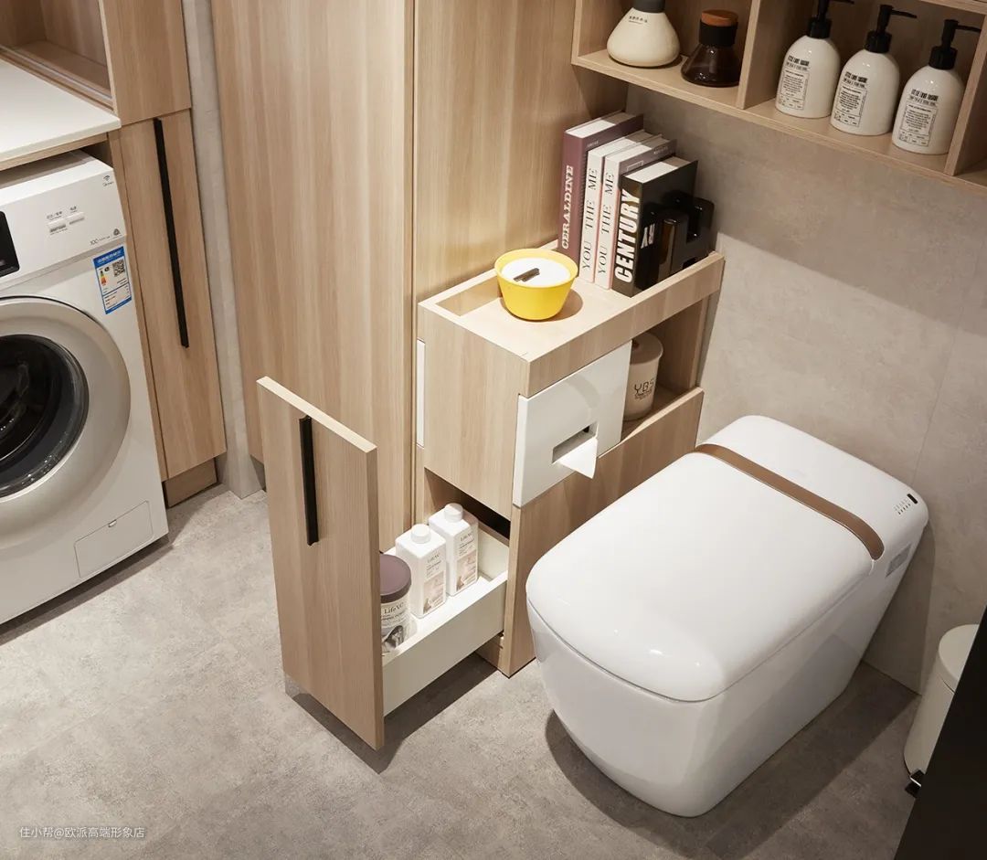 巧妙定制,方便区也能变身收纳区。马桶上方打造收纳吊柜,充分利用纵向空间扩容。马桶侧边柜可放置纸巾、手机等物品,方便如厕使用。