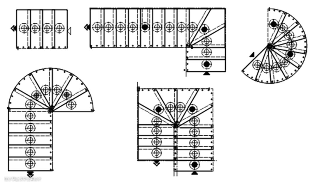 楼梯形状变化多样,最基本的形状有:直型、L型、U型、旋型、旋直型等。其余的形状都是由这几种组合演化而来的,图例