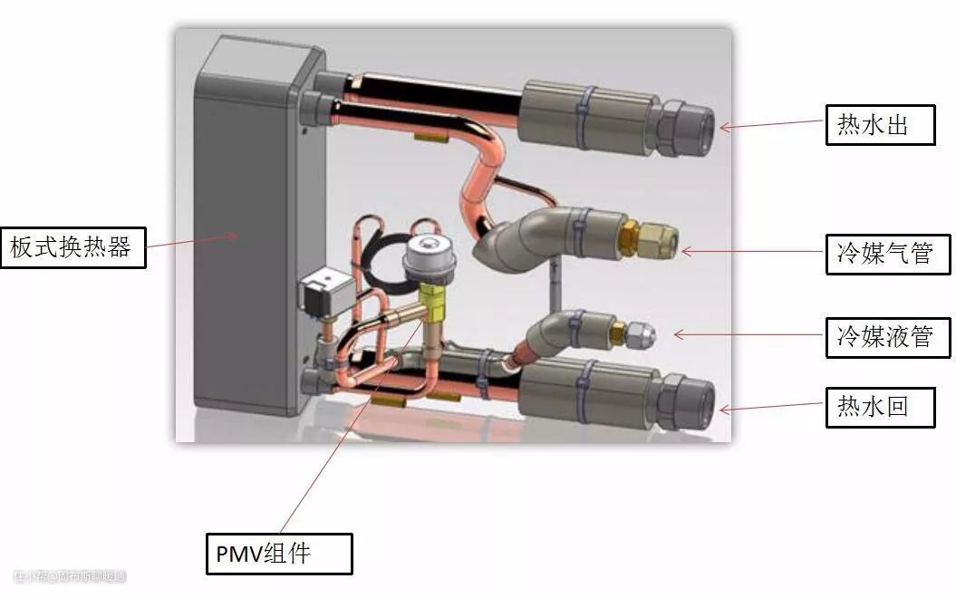 从图中可以看得到,它是氟系统的管道中任意位置分出来两根铜管连接地暖模块