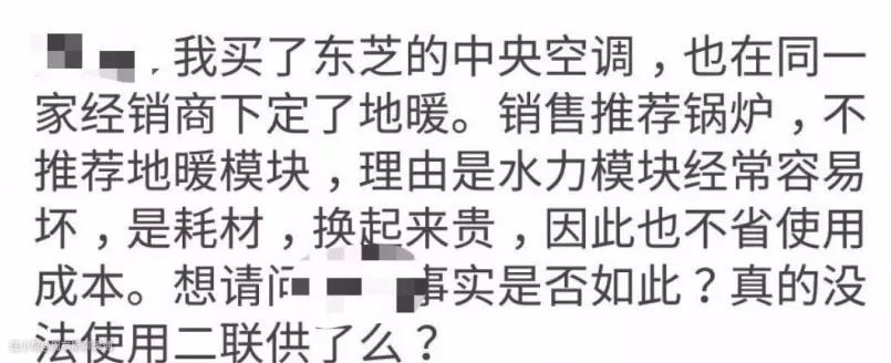 - 拆机网红D:原话“强烈吐槽东芝中央空调,既然推地热模块,就应该水利和换热器做一起,经销商搞的怎么把控?我觉得这些经销商是应该自我反思一下,水力模块就是个水泵和膨胀罐,而且东芝没有,经销商自己给用户配杂牌子还要说热泵地暖不可靠,这理由很奇葩啊,你给人家配杂牌子,坏了还假装善意提醒,难道不是锅炉赚钱多么。”