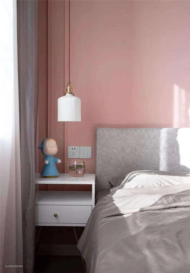 主卧室选用了少女色系的桃红嫩粉和淡胭脂粉。