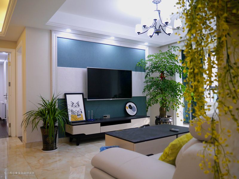客厅本身的户型比较方正,但是面积不大,所以吊顶就用简单的平面式,基本也都刷的大白墙,但是为了看起来有层次感,在电视背景墙上做了装饰,蓝白色块看起来很清爽。