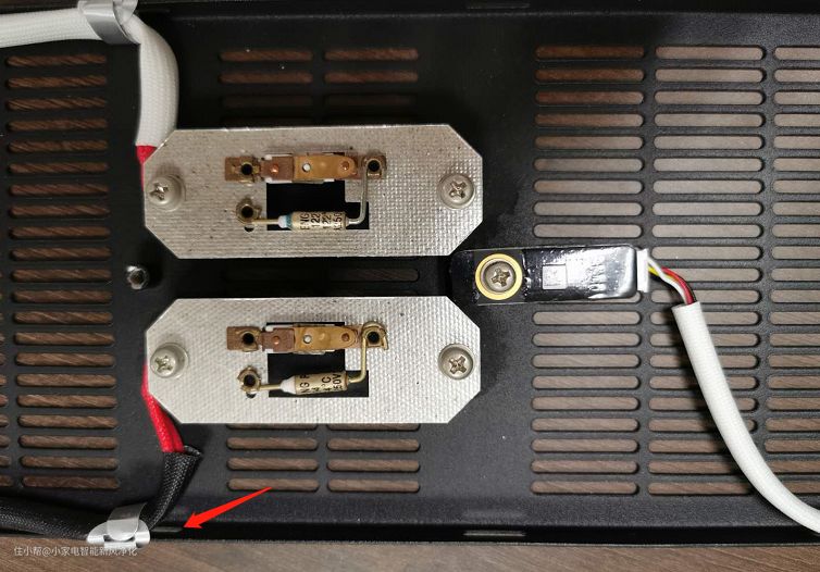 PTC保险使用2支80度的温控开关,2支120度的一次性保险,分别管控两组PTC加热模块,右边是温湿度传感器,监控出风口温度,注意看箭头位置的金属束线器,漂亮。▼