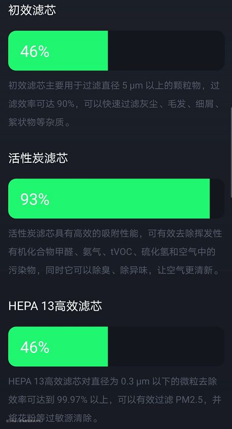 APP显示各滤网寿命还比还较多,高效使用时间一年,玻纤滤料,一般不会一年就失效,不排除是我使用过程中造成滤网损坏。活性炭是新换的,刚使用不久。▼