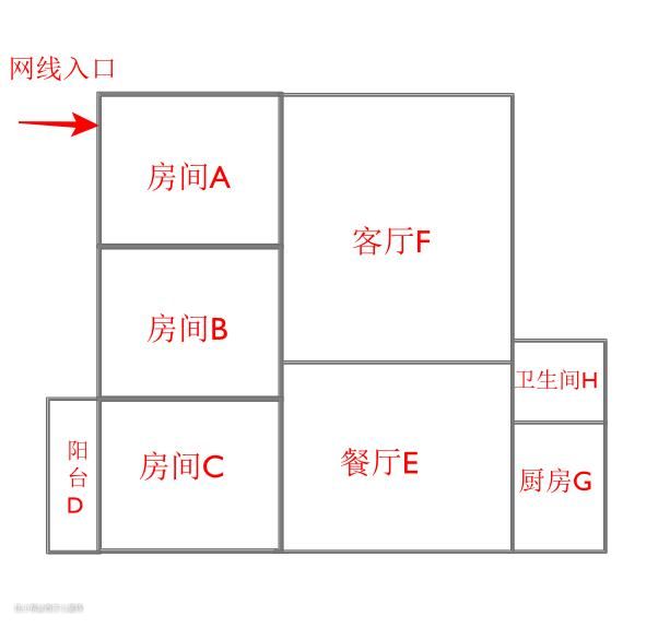 上图是我家户型示意图,共3室2厅1厨1卫,约140平米,网线入口在房间A。此前我家路由器在房间A。信号覆盖上ABCF区域较好,日常影音娱乐基本无压力;DE两个区域看高清在线及视频聊天时偶尔会有些卡顿;G和H的wifi表现令人相当失望,连接经常中断哪怕连上了速度也是非常缓慢,远不如4G流量。之前看过站内很多大佬的wifi6路由器评测及mesh组网方案,最终决定选择领势MR9600+AC6600套装,MR9600作为主节点放在A房间,两个AC2200分别放在C和E作为子节点,以无线mesh方式接入,另外一个AC2200备用。