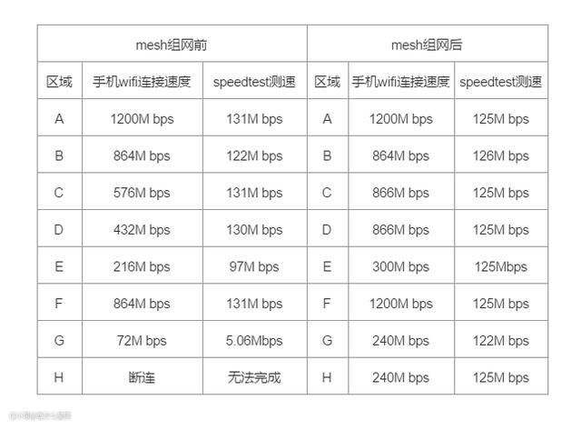 ▲上图为mesh组网前后全屋A-H八个区域的手机连接速度及speedtest测速结果对比。
